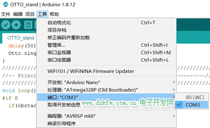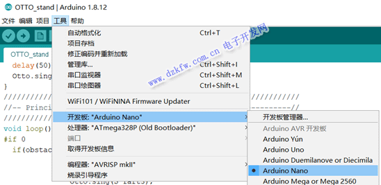 2)选择开发版类型:工具->开发板(以Arduino Nano为例)