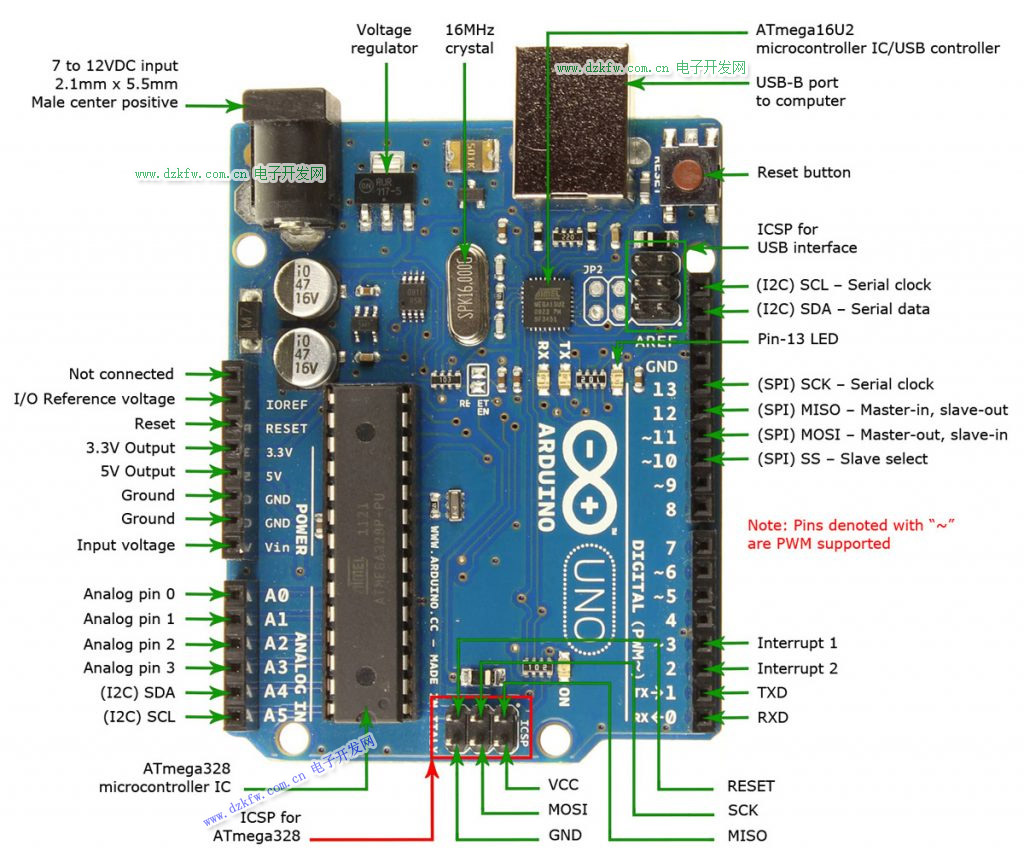 ICSP引脚:ICSP是一个AVR(自动电压调节器),通常称为SPI(串行外设接口),作为输出的“扩展”,把要输出设备从属到SPI总线的主机,通常由6个引脚。ICSP引脚旁边的“ON”电源LED显示灯表示是否由接通电源。