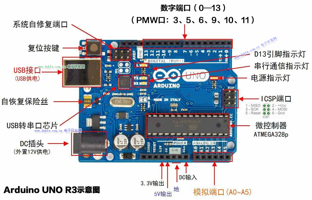 下面是一张Ardunio Uno R3的引脚图,包含14个数字引脚、6个模拟输入、电源插孔、USB连接和ICSP插头等。