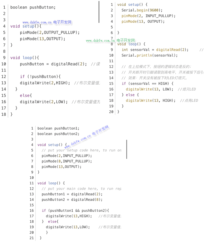 ●第三段代码运用了两个按钮操作,因此定义了两个boolean变量。但在if语句的判定中没有使用!运算,即运行结果为当两个按钮都没有按下时,13号引脚的状态为高电平,LED灯亮;当按下了其中一个按钮或者两个按钮时,13号引脚为低电平状态,LED灯不亮。
