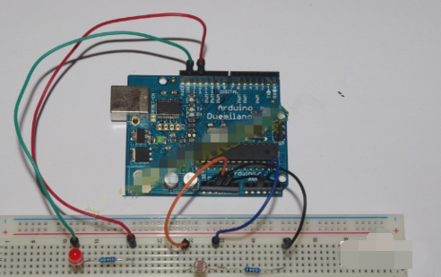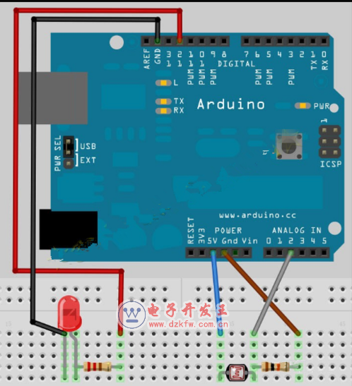 接着就是连线,下面就是实物图的连线,很简单,将光敏电阻一端接正极5V,另外一端接模拟口,A0-A5随意选。