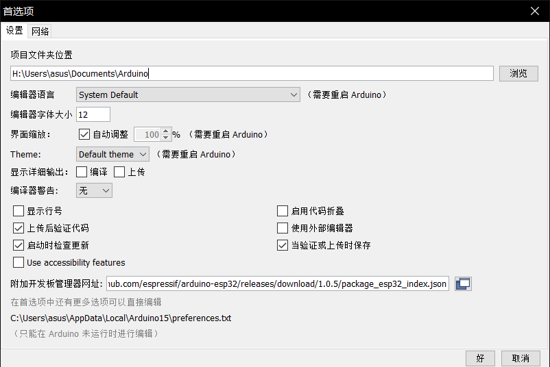 会出现一个对话框,在附加开发板管理器中添加 https://www.arduino.cn/package_esp32_index.json :