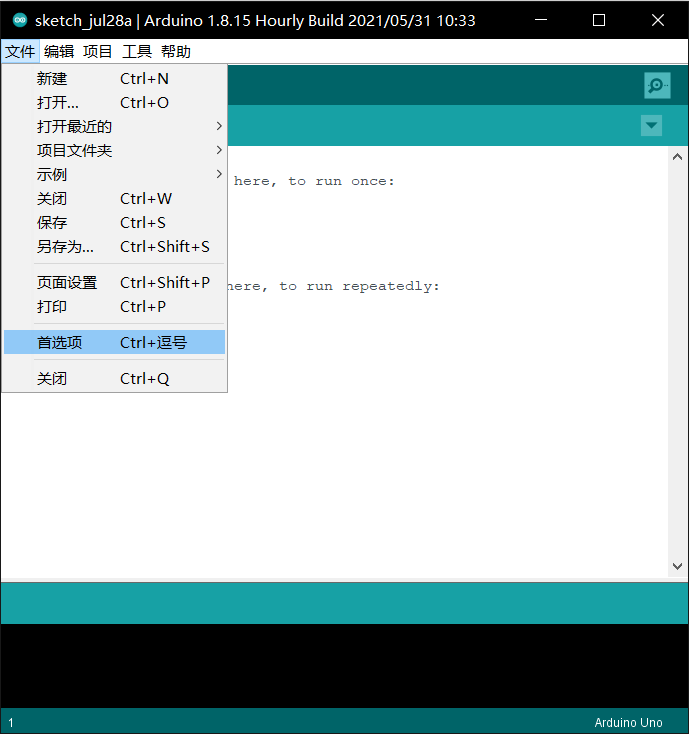 这里我就用安信可板子做例子,接上板子之后打开"文件"选项卡找到点击"首选项":