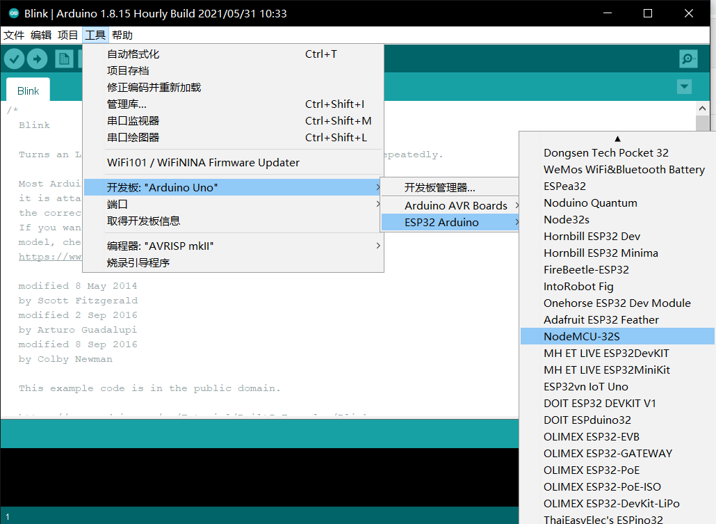安装完成后,再次点击"工具"选项卡找到点击"开发板",这次会多出一个 ESP32 Arduino 进去找到我们的NodeMCU - 32S: