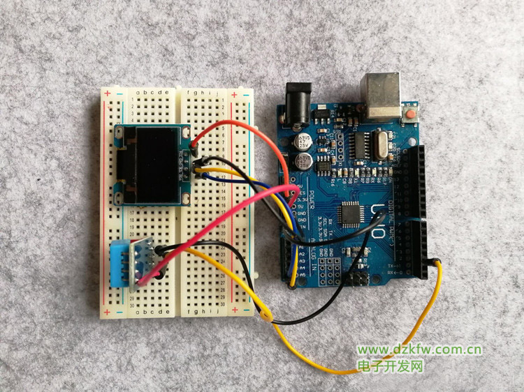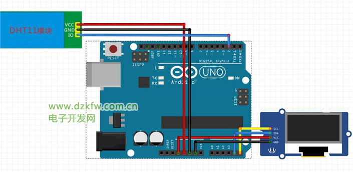 1. 根据原理图搭建电路图。OLED屏的VCC和GND分别连接开发板的3.3V和GND,OLED屏的SDA和SCL分别连接开发板A4和A5。DHT11模块VCC、GND分别连接到开发板的5V、GND,模块的DATA引脚连接开发板数字引脚2。
