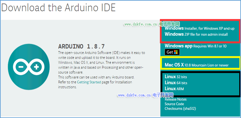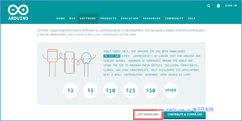 如果是Windows用户,则点击下载上图1-1中红色框内的Windows(ZIP-file),如果Mac,Linux用户上图中黄色框和黑色框内相应的系统。当点击Windows(ZIP-file)后会进入如下界面,只需点击图1-2红色框内的JUSTDOWNLOAD即可下载arduino-1.8.7-windows.zip,不需要支付任何费用。