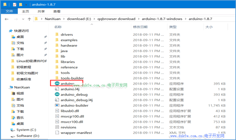 下载完成后,解压文件,把整个Arduino1.8.7文件夹放到你电脑中相应的位置,然后打开Arduino1.8.7文件夹,如下图1-3看到的内容。