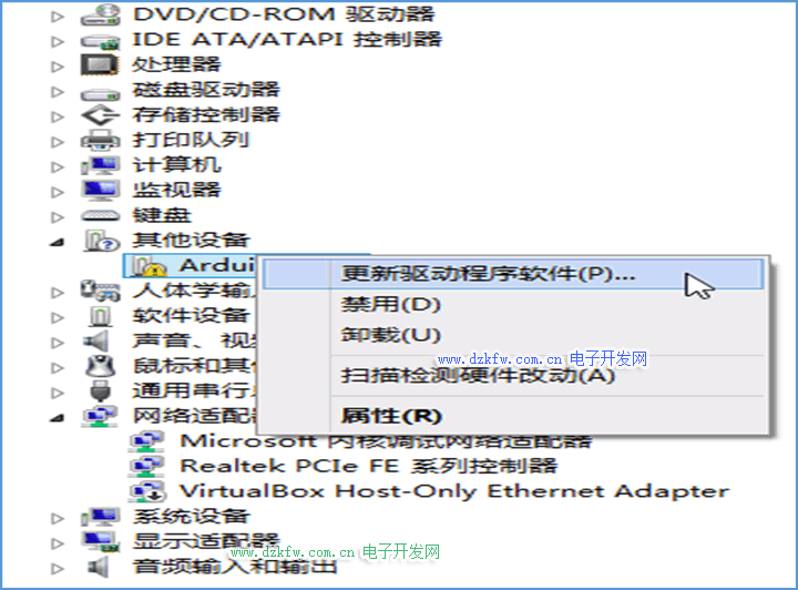 将USB数据线一端插到Arduino UNO上,另一端连接电脑成功后,UNO主板的红色电源指示灯ON亮起。打开电脑控制面板,找到并选择设备管理器。找到其它设备-->Arduino-xx,如下图1-4和图1-5所示,右击选择更新驱动程序软件。