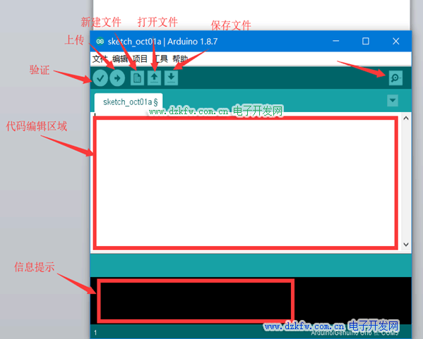 Arduino IDE是Arduino产品的软件编辑环境。简单的说就是用来编写程序程序、编译程序程序、下载烧录程序到主板的地方。任何的Arduino产品都需要编译下载程序到主板后才能运作。平时所搭建的硬件电路是辅助程序来完成相应的工作,两者是相辅相成的,缺一不可。Arduino IDE基本只需要用到上图1-10中红圈所标示出来的部分就差不多,图中白色区域就是程序程序的编辑区,用来编写程序。