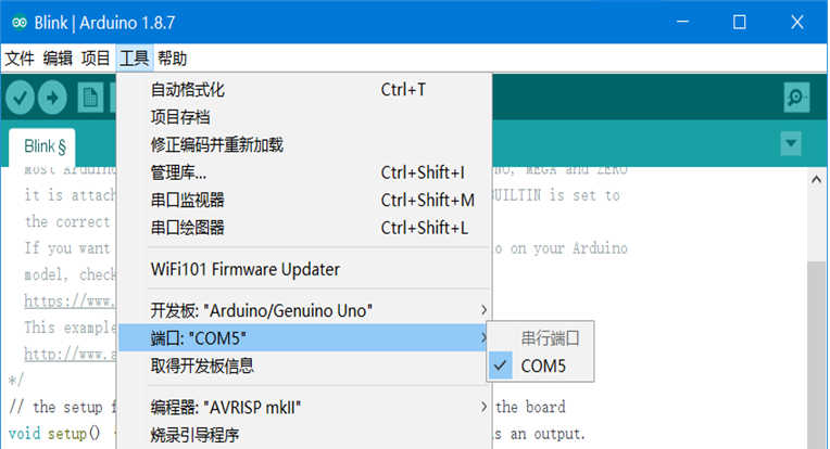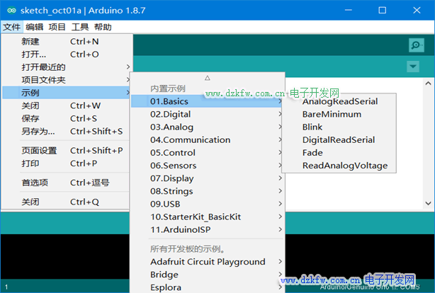 下载一个最简单的程序,即软件自带的测试示例程序,Arduino IDE自带许多示例程序,选取最简单的一个LED闪烁示例来学习即可,这样既可以帮你掌握如何下载程序,同时也可测试Arduino主板好坏。UNO主板上标有L的LED。这段测试程序就是让LED灯闪烁。用USB数据线将主板与电脑端相连,打开Arduino IDE后,找到“Blink”程序,如下图1-11和图1-12所示: