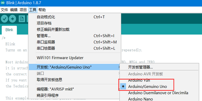 由于是测试示例程序,所以校验不会有错误,不过在以后编写完程序程序后,都需要编译校验,再下载到Arduino主板中。在下载程序之前,我们还要先告诉Arduino IDE板子型号以及相应的串口。如下图1-15所示,在菜单-->工具-->选择所用的开发板型号-->ArduinoUNO。