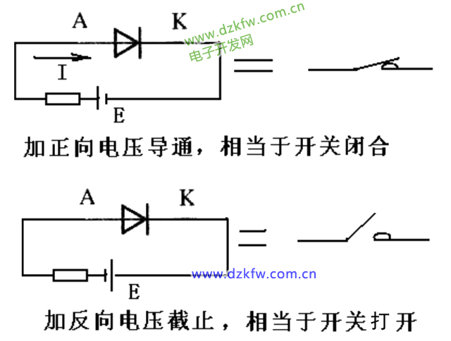 二极管是单向导电器件,加正向电压,导通,相当开关闭合;加反向电压,截止,相当于开关断开