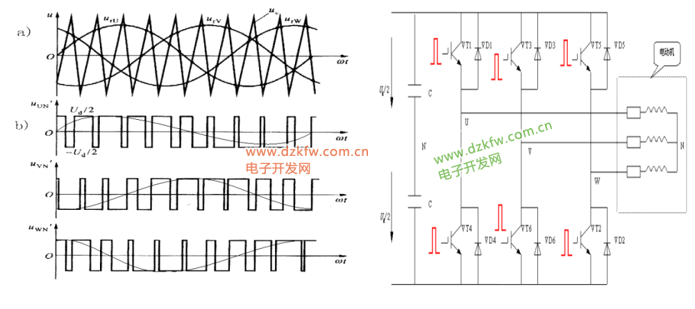 加在6只逆变管上的信号都为开关信号,6只逆变管就相当于6个开关,管子导通相当于开关闭合,截止时相当于开关断开。