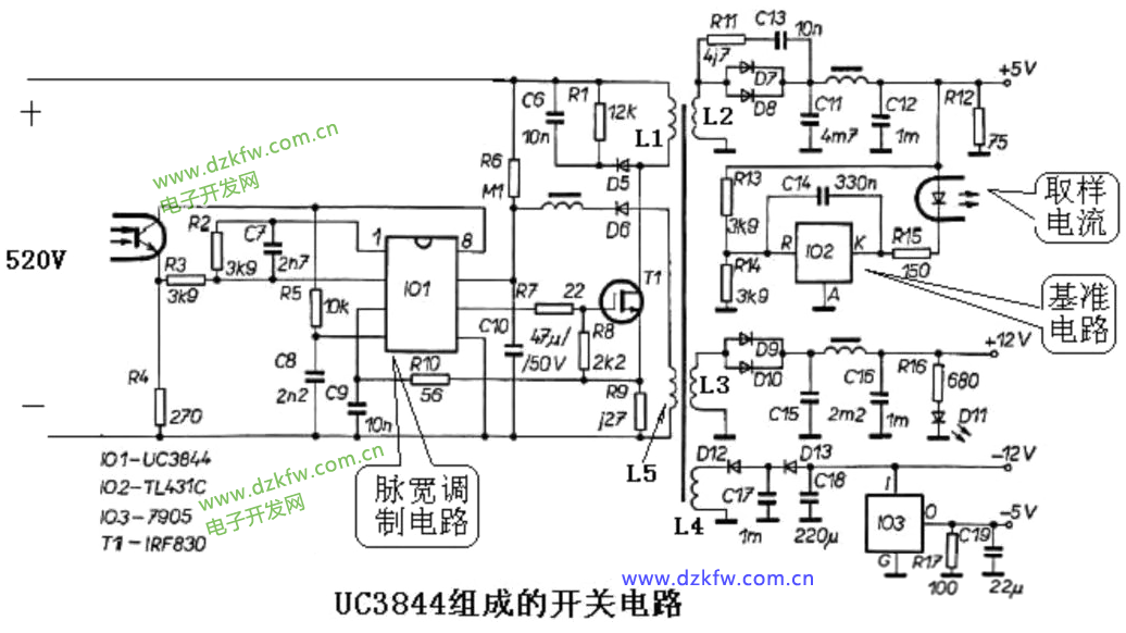 图中L1为一次电路,L2、L3、L4、L5为二次电路,工作时一次电路导通,二次电路截止,一次电路截止时,二次电路导通。二次电路的输出电压由开关管的脉冲宽度调节。