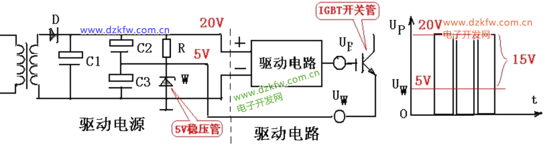 电路作用:为驱动电路提供直流电源。该电路由一只5V稳压管取得5V电源,加在IGBT开关管的发射极上,使驱动信号在零时,保证IGBT控制极为5V的负电压,使管子可靠的截止。