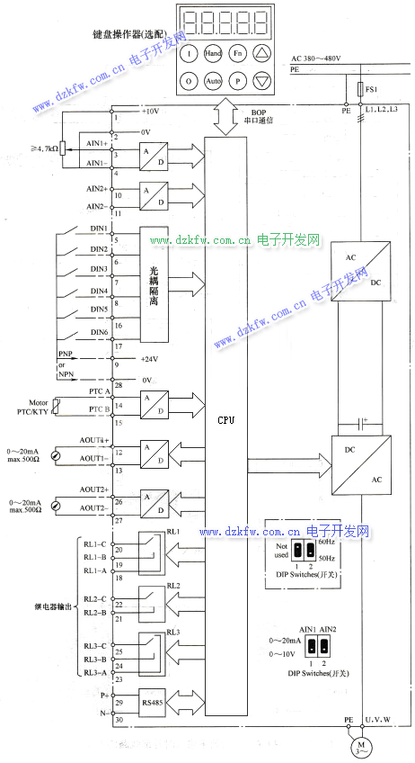 图1-12所示为MM430变频器的外部接线图,它与MM440变频器具有很大的相似性。 其外部接线主要包括: 1)模拟量输入A/D; 2)模拟量输出D/A; 3)开关量输入; 4)开关量输出。