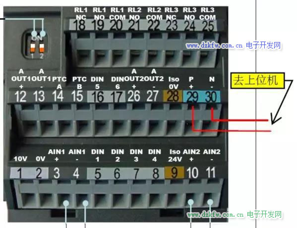 下图为I/O板上485口的端子位,端子29是P+,端子30是N-