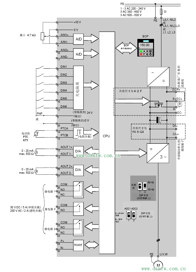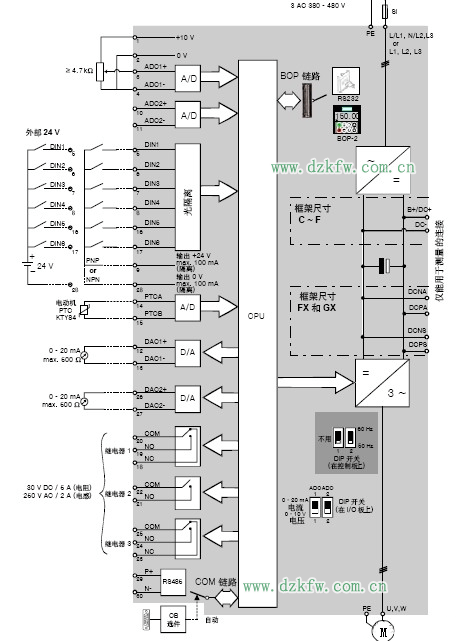 主线路分别接入三相电,输出端接电机。控制线路要看你什么控制方式,一般需要接的有启动信号,速度选择信号等。