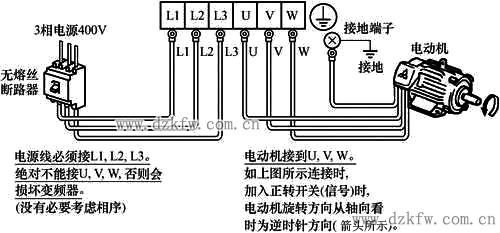 ②电源一定不能接到变频器输出端上(U,V,W),否则将损坏变频器。
