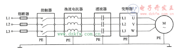 上图是一副变频器接线图。在变频器的安装中,有一些问题是需要注意的。例如变频器本身有较强的电磁干扰,会干扰一些设备的工作,因此我们可以在变频器的输出电缆上加上电缆套。又或变频器或控制柜内的控制线距离动力电缆至少100mm等等。