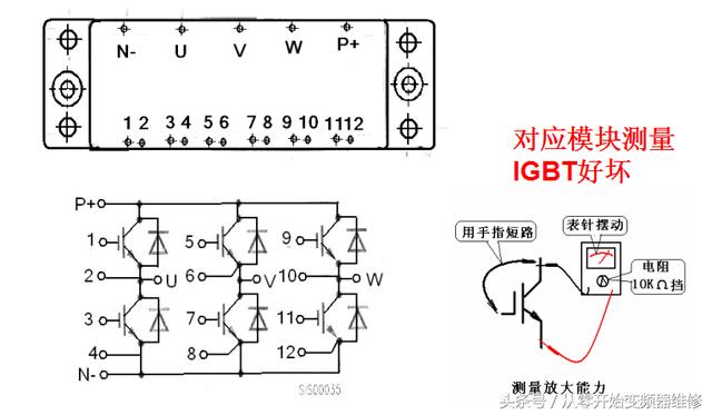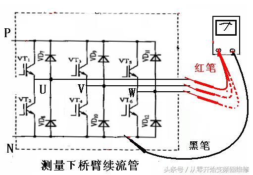 2. 测量方法:用指针万用表测量输出端(UVW)到直流母线上的直流电阻。