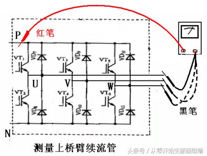 1)测量上桥臂黑笔接UVW,红笔接P点,表针摆动到刻度的3/5,正常,不摆动,断路。