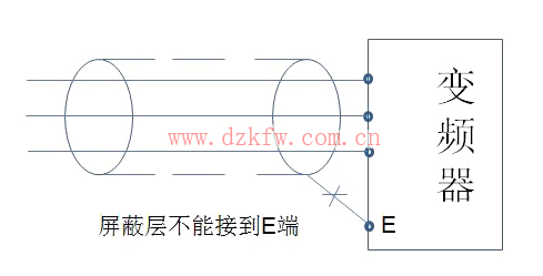 由于模拟量信号易受干扰,因此需要采用屏蔽线作模拟量接线。diangon.com模拟量接线如下图所示,屏蔽线靠近变频器的屏蔽层应接公共端(COM),而不要接E端(接地端),屏蔽层的另一端要悬空。