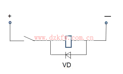 图中线圈断电后会产生很高的左负右正反峰电压,二极管VD马上导通而使反峰电压降低,为了使能抑制反峰电压,二极管正极应对应电源的负极。