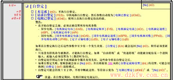 具体操作为:进入“1.1简单设置” 或“1.4电机控制”菜单,进入自整定(tUn)参数,选中“请求自整定(YES)”,按“ENT”按键,变频器自动对电机进行自整定。如果自整定成功,屏幕显示“电阻已整定(done)”,否则显示“no”。