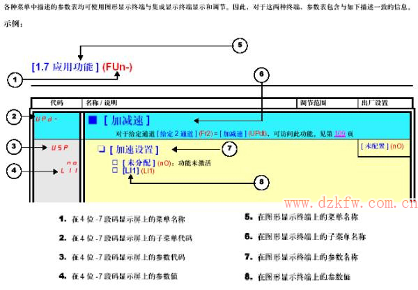 其他参数的设置可参照这个流程。具体可设置的参数内容和设置方法请参阅产品 ATV61用户手册 。