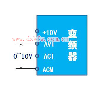 该方式是在AVI、ACM端子之间直接输入0~10v电压,给定频率就在0~50Hz之间变化。