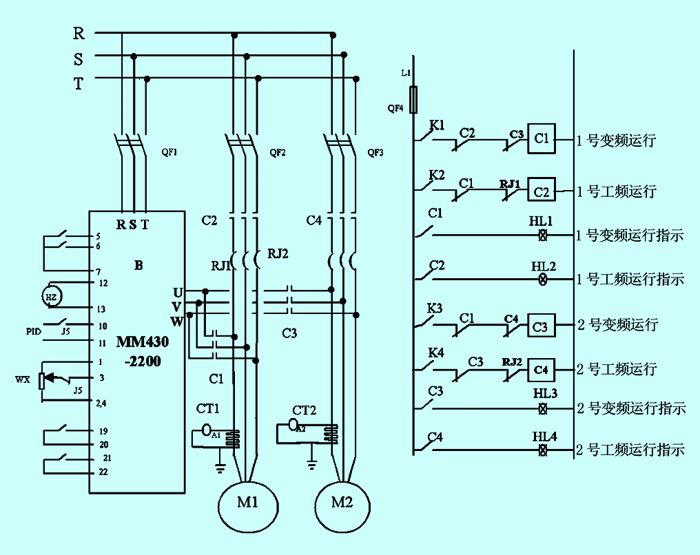 变频器及控制系统的其它电子电气元件作为本系统的执行机构,作为变频调速控制主体,可控制水泵的起停、加减速运转以及泵间的相互切换等。其原理图如图2所示。