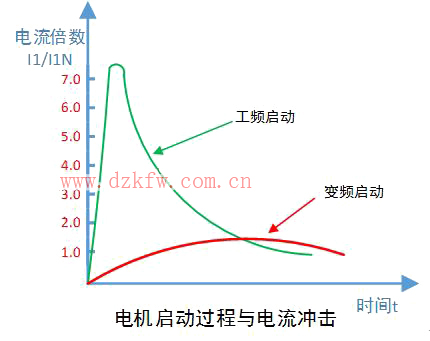 用市电直接启动电机,其启动电电流为电机额定电流的5-7倍。这种电机直启情况下,会导致电网电压下降,影响其他用电设备的正常运行。