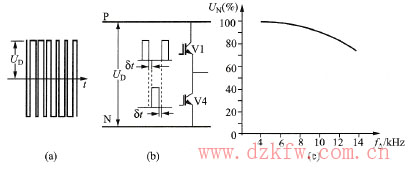 载波频率越大,则每个周期内交替导通的次数越多,总的死区(∑δt)越大,变频器的输出电压就越小,如图(c)所示。