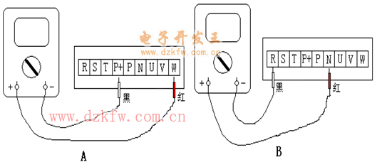 首先把数字万用表打到“二级管”档,然后通过数字万用表的红色表笔和黑色表笔按以下步骤检测变频器主回路: