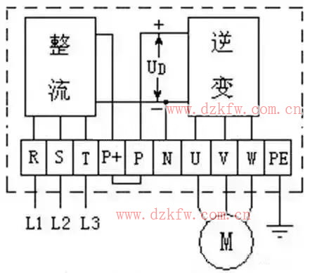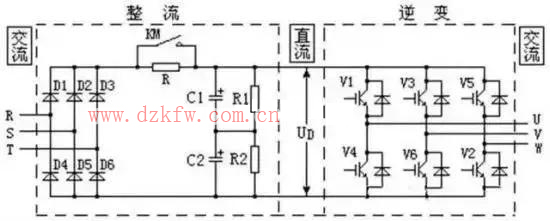 从R、S、T端输入的三相交流电,经三相整流桥(由二极管D1~D6构成)整流成直流电,电压为UD。