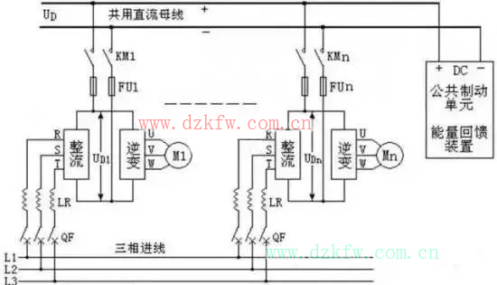 若共用直流母线与能量回馈单元组合,就可以将直流母线上的多余能量直接反馈到电网中来,从而提高系统的节能效果。