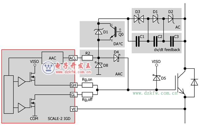 SCALE?-2芯片组还用于实现复杂的有源钳位技术,以应对前面提到的其他IGBT失效模式——di/dt过高、dv/dt过高以及门极-发射极和集电极-发射极过压。