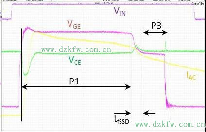 VCE退饱和在P1时间(绿线)内可见,由于采用轨到轨输出技术,VGE(门极-发射极电压,粉色线)始终非常稳定。经过P1(约5 μs)后,VGE在特定时间(tFSSD)内被限定到较低值。在tFSSD期间,IC(短路电流)被限制,最初会出现较小的VCE过压。在P3期间,半导体的门极进一步放电。在放电过程即将完成时,门极会连接到COM,VGE迅速下降到关断负电压,剩余的门极电荷被移除,短路电流被切断,然后再次出现较小的VCE过压。整个短路检测和安全关断时间不到10 μs。Power Integrations通过新版SCALE-2技术SCALE-2+做到了这一点,该技术可实现AAC/DA2C或SSD功能。