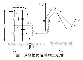 逆变电路的每个逆变管两端,都要反向并联一个二极管,如图1(a)所示。其作用描述如下:异步电动机的定子电路是感性电路,其电流的变化滞后于电压,如图1(b)所示。图中:
