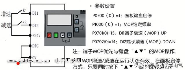 P1000(0)=1:面板的上下键来增速和减速。其他参数使用出厂值,主要应用于初次调试。