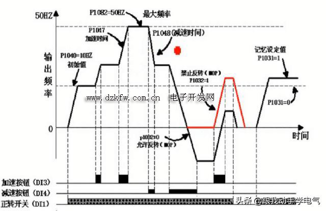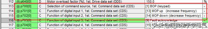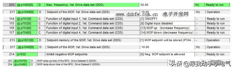 1)主频率源选定参数P1070,如上面所讲的P1070(0)=1050;表示MOP增速/减速给定频率方式。r1050(0)=MOP操作的实际输出频率