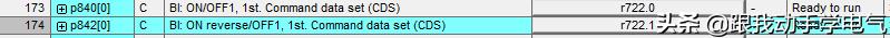 2)启停命令源选定参数:P0840(0)启停命令信号源,设置P0840=r722.0,表示DI1端子启停,如设置P0842=r722.1,表示DI2端子反转启停。如下图所示。