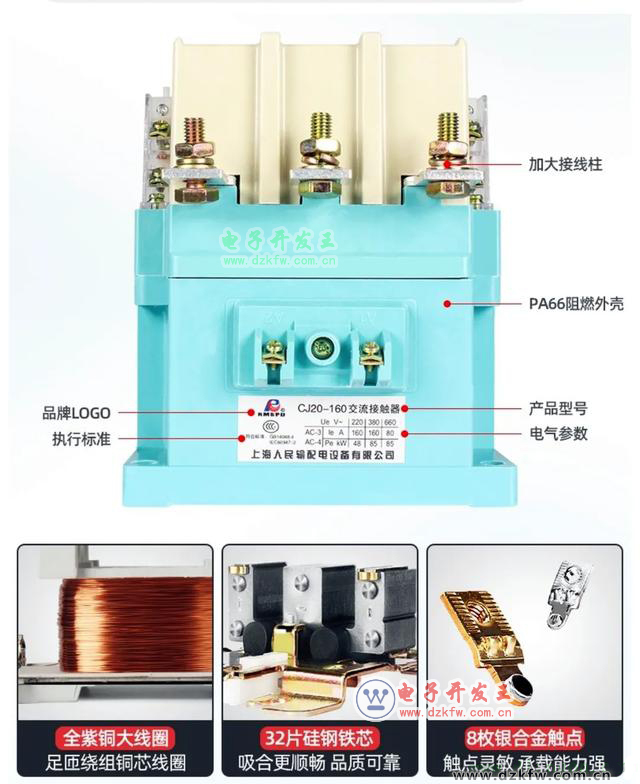交流接触器主要由两个系统组成;电磁系统和触点系统。其中电磁系统接受控制信号,触点系统是执行部件。在接受控制信号后,通过触点的闭合和断开来按通或分断电路。接触器一般都带有灭孤装置,以利于主触点在断开电路肘熄灭触点间电弧。