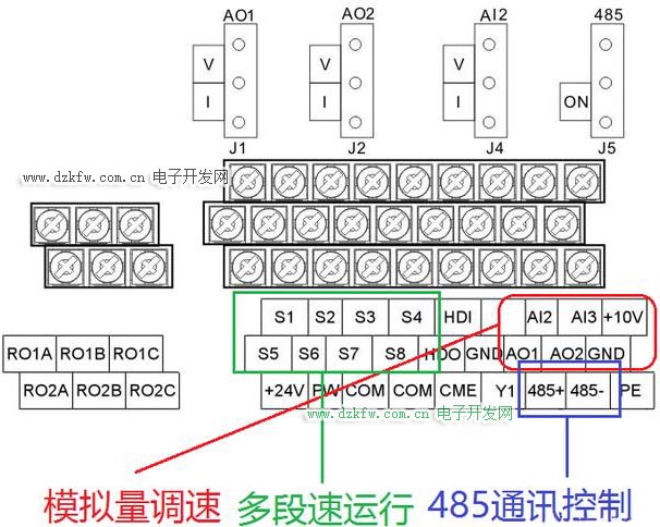 上图就是变频器的正面图,采用本地调速可通过键盘数字的加减、键盘上的电位器来进行频率设定,其他方法可通过下面的端子实现,其中AI2、AI3、10V用于模拟量输入,AO1、AO2是模拟量输出端子,参考其使用手册AI2是电压(0~10v)或者(0~20ma)的信号控制,AI3是-10v~+10v的信号控制,绿色框框代表的就是多段速的接线端子,蓝色的485通讯接口,可采用MODBUS协议进行通信(半双工)。