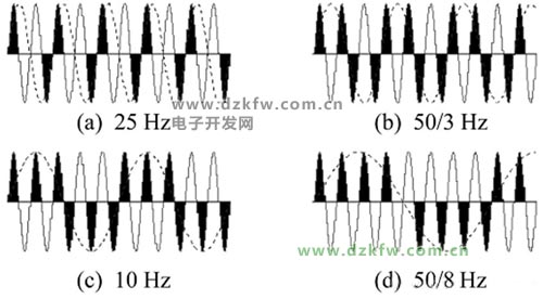 变频软起动器的全称是分级交-交变频软起动器,也称为离散变频软起动器。变频软起动器利用三相交流调压回路,通过控制三相晶闸管的触发顺序,使晶闸管导通一个或者多个半波周期,对电网电压进行斩波,使几个工频周波内去掉一部分工频上半波和一部分工频下半波,实现电机端电源频率变化的目的。几种频率波形示例如下图: