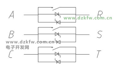 从图二中可以看出,变频软起动器的主回路是由六只晶闸管两两反并联组成的三相交流调压回路和短接开关并联构成。电机起动时,晶闸管工作;起动完毕后,短接开关动作,短接晶闸管,晶闸管停止工作。