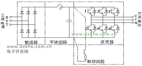变频器主要由整流回路、平波回路、逆变回路以及制动回路构成,共计需用12只电力电子器件。当前大多使用六只电力二极管用于整流回路,六只IGBT用于流变回路。整流回路将工频交流电变为脉动的直流电,平波回路将脉动的直流电变为平整的直流电,逆变回路将直流电变为所需频率的交流电。