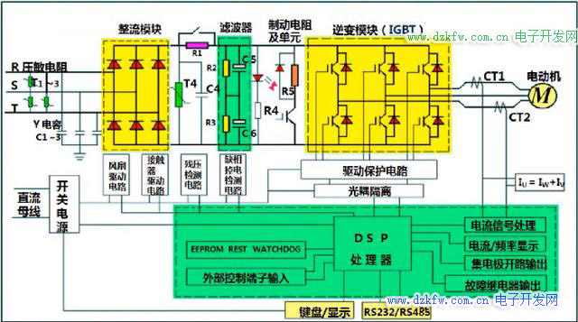 (7)逆变单元:一般都是IGBT,是变频器的核心部件,其实IGBT相当于是一个开关,开关频率很高2KHz~20KHZ(载波频率),耐高压(1200V),电压型驱动,驱动电压15~20VDC,驱动电流10mA~16mA。