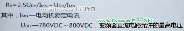(6)制动单元与制动电阻:考虑到电机处于发电状态,通过二极管整流成直流,电压持续升高,变频器容易过压保护,所以,加制动单元和制动电阻,当检测到电压700V左右时,使IGBT接通,把电机发电的能量消耗在制动电阻上.制动电阻选择换算公式如下所示: